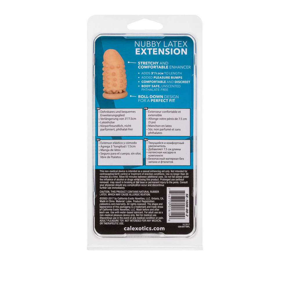 Unlock the benefits of mindful intimacy with the beautifully designed Latex Extension Nubby. Made with high-quality, body-safe materials, Latex Extension Nubby delivers targeted stimulation and elevated sensations. Whether you're exploring solo or with a partner, this pleasure product promotes relaxation, stress reduction, and sexual confidence. A key addition to your wellness toolkit, it combines function, elegance, and intentional design. Latex Extension NubbyExtend your sensual pleasure with the easy to use, super life-like Latex Extension. The flexible, soft and supple erection extension is designed to maximize arousal and satisfaction. Elevate your intimate playtime fun with the smooth, natural looking head, sensually pleasure-beaded for an intensified orgasmic encounter.The discreet Latex Extension is made from super stretchy latex for the ultimate snug and comfortable fit. The extension sleeve features a textured exterior finish and a roll down design, for easy application and removal. The extension instantly adds length to your size for an elevated performance every time. For maximized satisfaction always use a water-based lube with this toy.The nubby textured Latex Extension is easy to travel with, just for those unexpected encounters. Indulge in secret fantasy play, with this comfortable to wear personal enhancer that is made for mutual pleasure and erotic satisfaction. Before and after every use, remember to clean the extension with a toy cleaner spray.3”x 1.25”/8 cm x 3 cmSoft and supple penis extension with roll down sleeveLatex